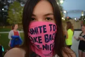 SNHU student at the annual event posing with, “unite to take back the night,” merchandise. (photo credit: Nick Klotz)